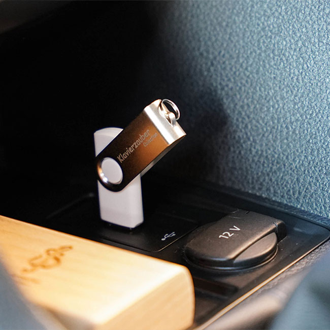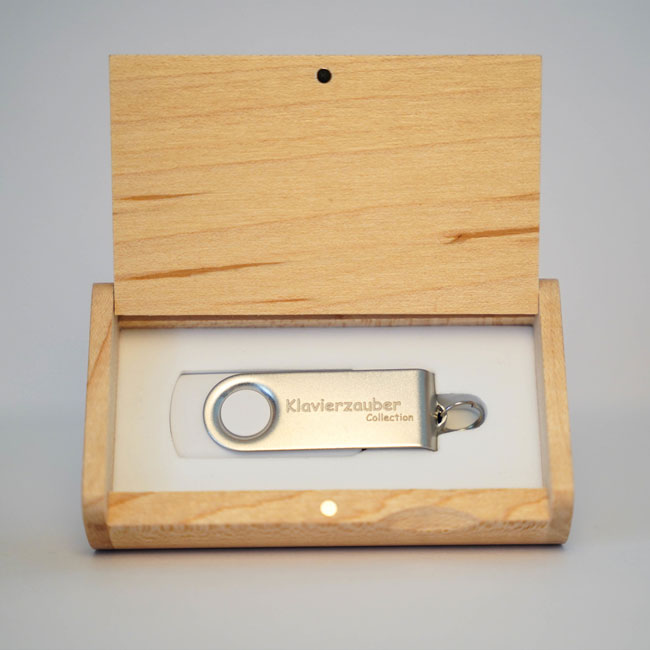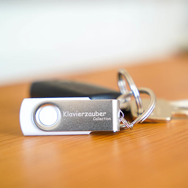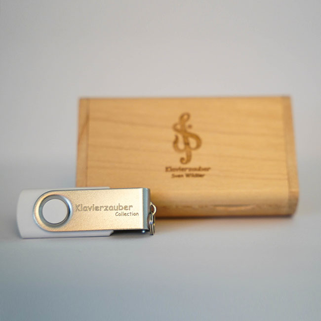 • USB-Stick (weiß/silber) mit Gravur »Klavierzauber Collection« und »Sven Wildöer«