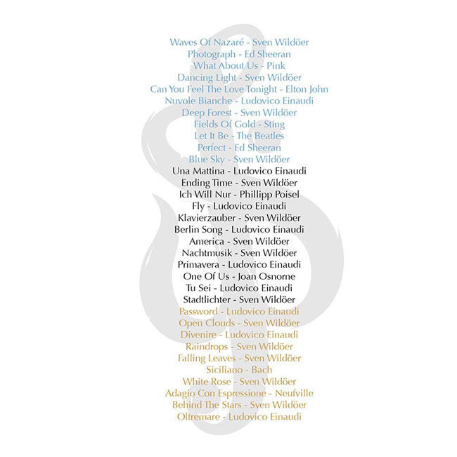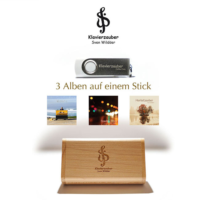 Pianomusik zum Träumen und Entspannen von Sven Wildöer. Die 3 Alben »Waves«, »Stadtlichter« und »Herbstzauber« als MP3 auf USB-Stick in einer eleganten Holzschatulle als hochwertige Special-Edition. Perfekt als Geschenk und/oder für alle, die kein CD-Laufwerk mehr besitzen.
