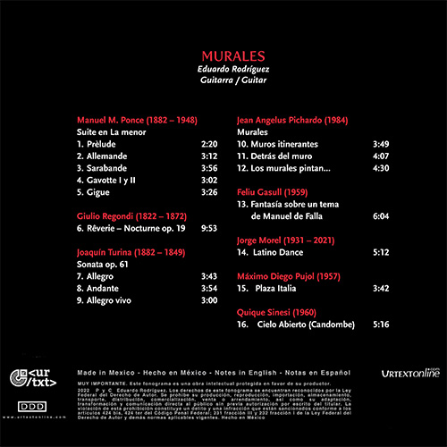 Diese Aufnahme ist eine Zusammenstellung von Werken für Gitarre, die die künstlerische Entwicklung des Interpreten geprägt haben. Von barocker und romantischer Musik bis hin zu spanischen Werken mit Einflüssen aus der Flamenco-Tradition und lateinamerikanischen Stücken mit traditionellen Rhythmen. Es trägt den Titel "Murales", der auch der Name des zentralen Stücks auf dem Album ist. Dieses Stück wurde von dem mexikanischen Komponisten Jean Angelus Pichardo komponiert und Eduardo Rodríguez gewidmet. Drei Stücke für klassische Gitarre wurden auf dieser CD zum ersten Mal aufgenommen: Murales von Jean Angelus Pichardo, Latino Dance von dem Argentinier Jorge Morel und Fantasía sobre un tema de Manuel de Falla von dem katalanischen Komponisten Feliu Gasull.